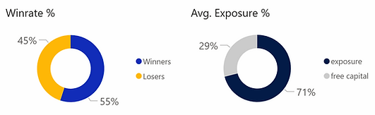 An average exposure of 71% means that part of the capital remains free, mostly in the bear market periods.