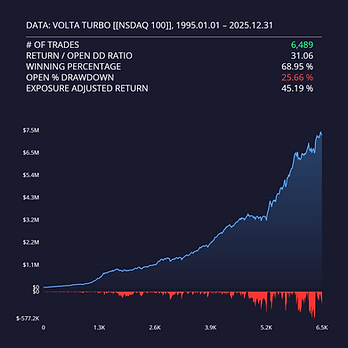 The Volta strategy uses a volume-based indicator as its foundation, which distinguishes the strategy profile from most typical reversal strategies. It is a mean reversion strategy that waits for a quick pullback in an uptrend.